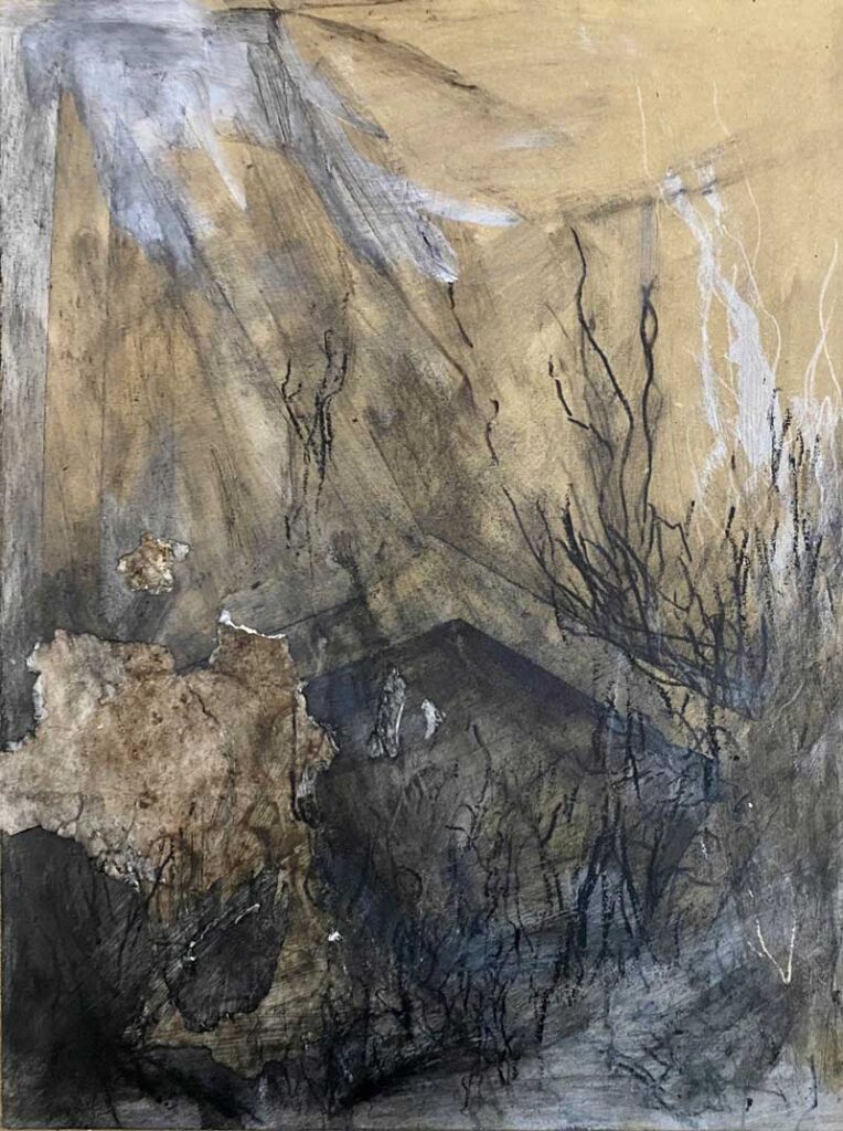Delirio místico. Este trabajo llega como continuación de una búsqueda más profunda que incluye momentos y experimentaciones previas en las que está presente – siempre en clave introspectiva- una invocación a la naturaleza y al vínculo que los seres humanos establecemos con ella. Podemos apreciar múltiples representaciones de carácter abstracto que podrían dar cuenta de una visión interna perturbadora: la inmersión del hombre en el monte, con su respectiva atmósfera, reconocible por logradas texturas, trazos y colores acromáticos que dan cuenta de ese proceso.