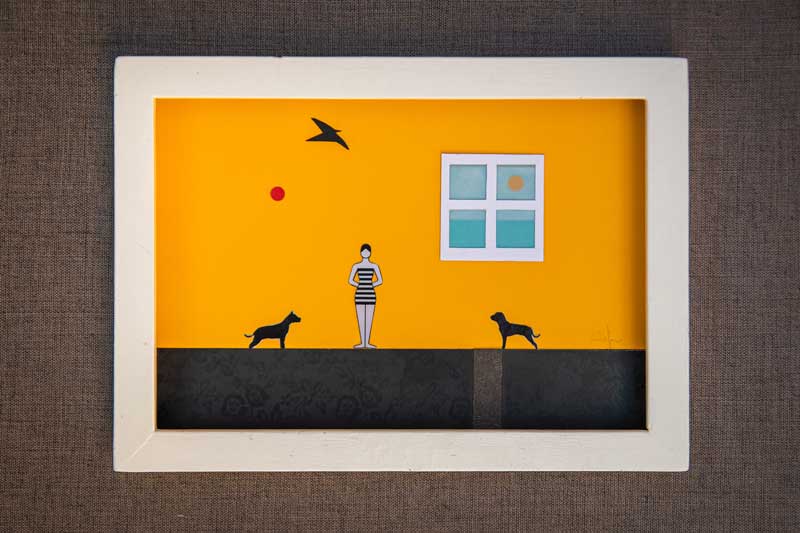 La obra aborda la relación del hombre con la naturaleza, a partir de una pregunta vital por el instinto y la convivencia de las personas con los animales. La serie -organizada en forma de instantáneas- presenta un relato basado en el encuentro fugaz entre animales y personas -con reminiscencias oníricas y fantásticas- que busca transportar el mundo salvaje a los contextos humanos. La presencia enigmática de los animales junto a distintos objetos propios de la cultura moderna refuerzan el carácter paradojal de esas figuras. Animal y hombre no aparecen retratados en un vínculo de subordinación ni sometimiento, si no que comparten una voluntad de vivir, aunque en posiciones distantes y que, muchas veces, se resuelven en un gesto amoroso de contemplación y deleite. La variación en los fondos recrea momentos de ensoñación y evoca el pasaje del mundo natural al ámbito cotidiano a través de estados de gracia y recogimiento. La repetición de algunas figuras y el predominio de ciertas formas geométricas habilitan el juego de la libre asociación en un espacio construido con contrastes de color. Finalmente, la elección del papel -un material orgánico- para la composición de los collages refuerza el concepto vitalista de la obra. Texto: Fernanda Juárez