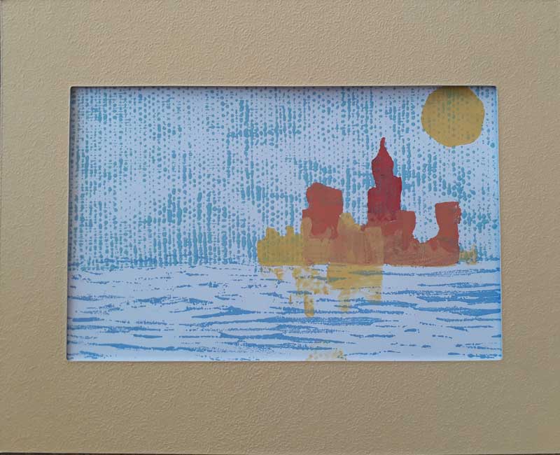 - Técnica: Sellos de linóleo sobre papel